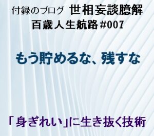 その四からその七まで 百歳人生航路 #011 百歳人生心得帖の第二回目は、十箇条のその四からその七までを解説します。 いずれも人生航路に必要な心得となります。 1. その四 金より頭を使う 体を使う 気を遣う お金は人間 […]