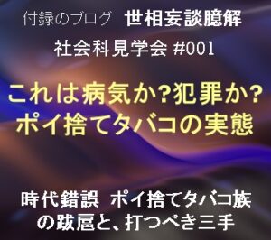 時代錯誤のポイ捨てタバコ族の跋扈と、打つべき三手 社会科見学会 #001 この社会科見学会は、世の中のどうにも合点が行かないありきたりの問題・課題をいささか怒りに燃えつつ見て […]