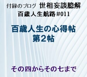その四からその七まで 百歳人生航路 #011 百歳人生心得帖の第二回目は、十箇条のその四からその七までを解説します。 いずれも人生航路に必要な心得となります。 1. その四 金より頭を使う 体を使う 気を遣う お金は人間 […]